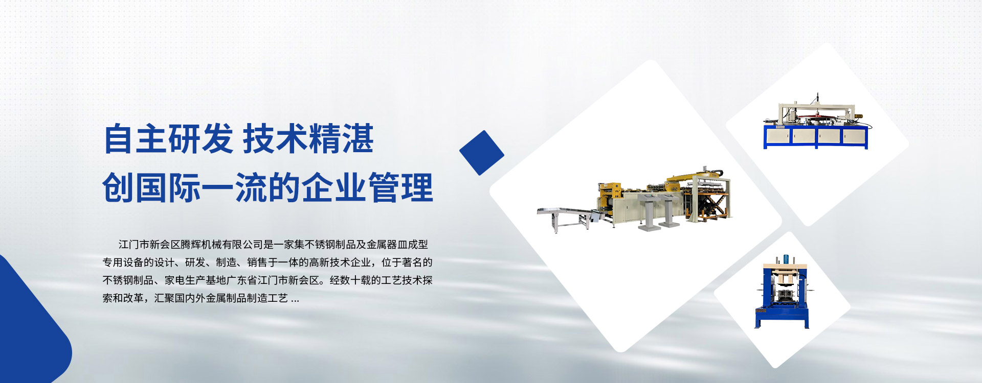 江門市新會區(qū)騰輝機械有限公司是一家集不銹鋼制品及金屬器皿成型專用設備的設計、研發(fā)、制造、銷售于一體的高新技術企業(yè),位于著名的不銹鋼制品、家電生產(chǎn)基地廣東省江門市新會區(qū)。經(jīng)數(shù)十載的工藝技術探索和改革,匯聚國內(nèi)外金屬制品制造工藝。